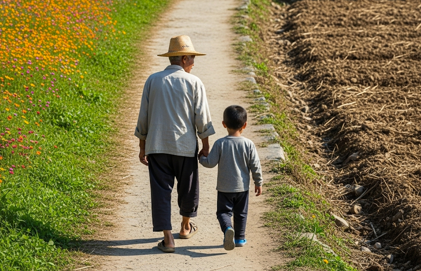 Cậu bé cúi nhìn và sững sờ. Một bên lối đi khô cằn. Nhưng bên còn lại – nơi nước rỉ từ chiếc bình nứt – đầy những bông hoa đang nở rộ, đủ sắc màu.