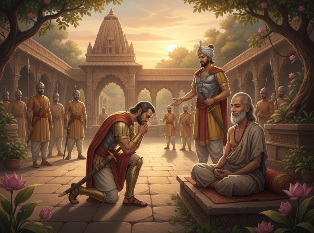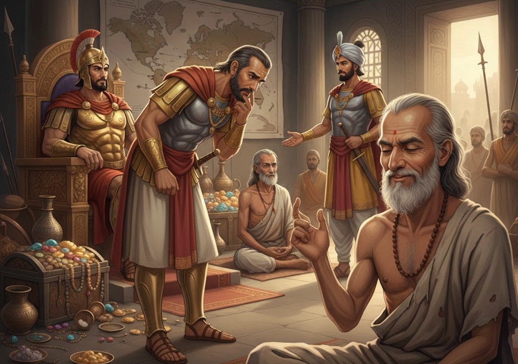 Vị quân vương nhìn theo phía tay vua Ấn Độ. Ở đó, có một vị tu sĩ ăn mặc rách nát, gầy gò, đang ung dung ngồi.