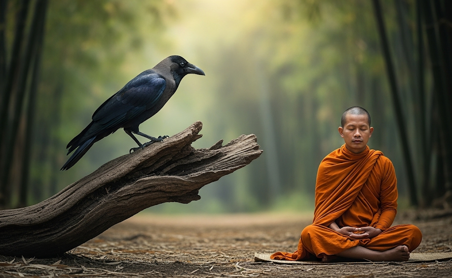 Trong khu rừng nọ, có một con quạ sống buồn bã và đầy bất mãn. Một ngày nọ, nó ngồi trên cành cây mà khóc thút thít. Dưới gốc cây là một vị tu sĩ đang ngồi thiền tĩnh lặng. Một giọt nước mắt của quạ rơi xuống má vị tu sĩ, khiến ông ngẩng lên và hỏi:
