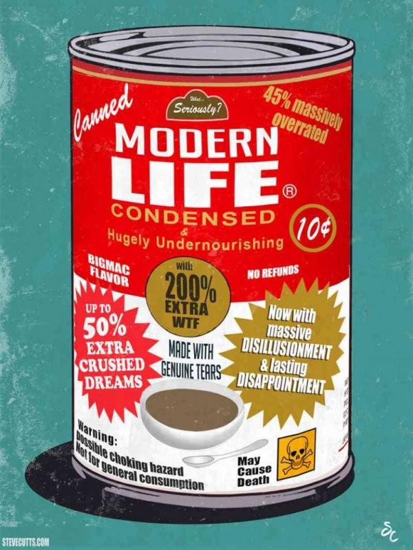 Các cụm từ trên thân hộp ‘thức ăn nhanh’ miêu tả thực trạng xã hội ngày nay. Chúng ta đang tiêu hóa những sự ‘tâng bốc phóng đại’, ‘thất vọng’, ‘ảo tưởng’, đảm bảo sẽ được ‘vỡ mộng’, ‘rơi nước mắt’, thậm chí gây ‘chết người’. ‘Thức ăn độc hại’ nhưng vẫn thu nạp, cả thức ăn vật chất lẫn tinh thần, đó là nguồn gốc của bệnh tật.