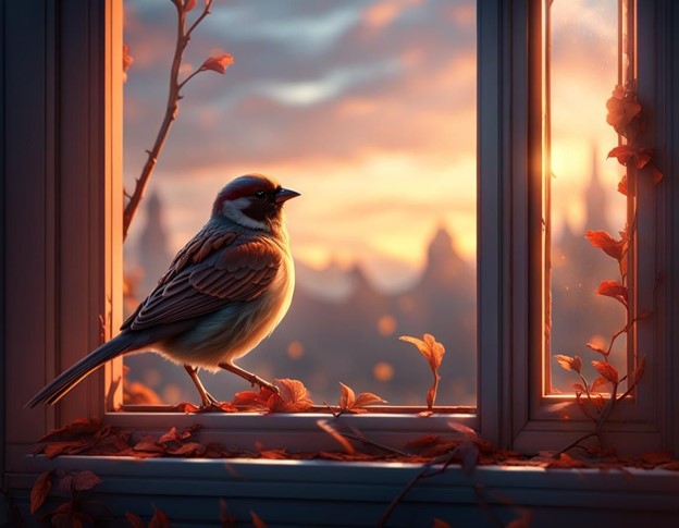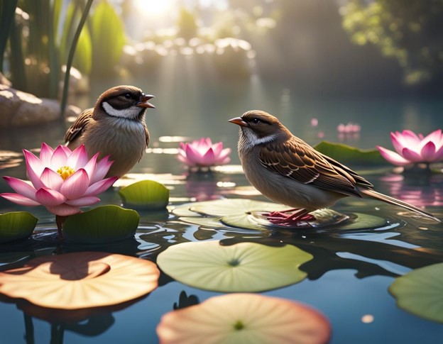 Thảng hoặc khi tôi cứ mải cúi đầu vào bàn viết, lại có chú se sẻ nào đấy bay đến đậu trên song cửa, nhìn về phía tôi và hót réo rắt không thôi. Dường như chú muốn bảo với tôi rằng “ Này cô gái, thôi đừng mải miết nữa, mà hãy ngước lên và ngắm nhìn, mặt hồ đã lại sáng lên”.