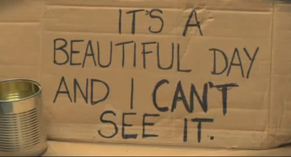 Người đàn ông đã viết trên tấm bảng như sau: “Hôm nay là một ngày đẹp trời nhưng tôi không thấy được”.