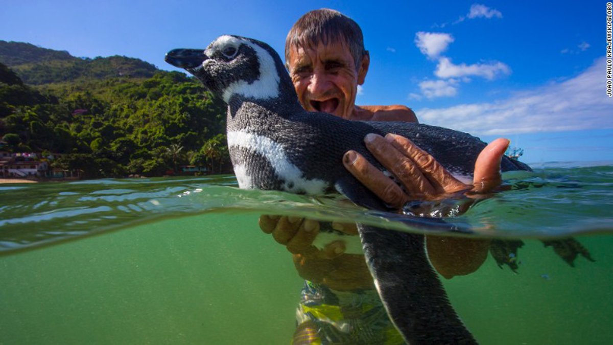 Năm 2011, ông Joao Pereira de Souza, ngư dân 71 tuổi người Brazil, tìm thấy một con chim cánh cụt nhỏ bé bị dầu bao phủ toàn thân và sắp chết đói trên một bãi biển thuộc hòn đảo cách xa Rio de Janeiro. Pereira de Souza đặt tên cho con chim cánh cụt là Dindim. Theo Pereira de Souza, Dindim trở nên gắn bó với ông sau khi ông đưa nó về nhà, làm sạch những chiếc lông dính dầu và cho nó ăn cá trong suốt một tuần. Pereira de Souza thả con chim về biển khi thấy sức khỏe của nó đã cải thiện. Nhưng con chim không bỏ đi. “Nó ở với tôi suốt 11 tháng. Nó chỉ biến mất sau khi thay lông". Joao cho biết.