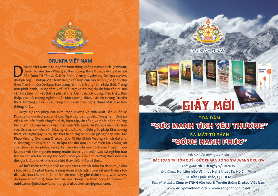 Thứ Hai ngày 05/10/2015, tại trụ sở Liên Hiệp Các Hội Văn Học Nghệ Thuật TPHCM. Với sự hiện diện gia trì của Đức Pháp Vương Gyalwang Drukpa.