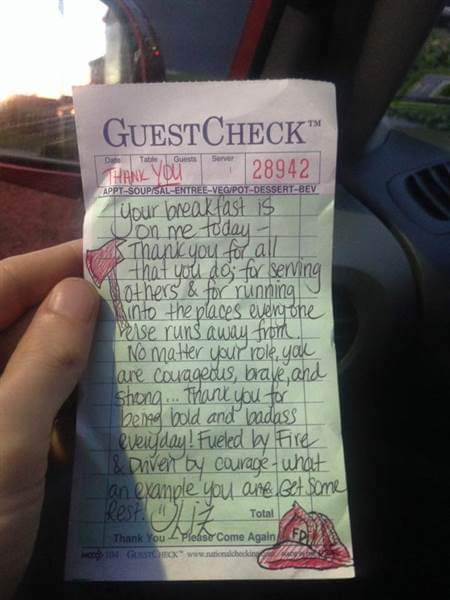 “Tôi cần ly cà phê lớn nhất mà bạn có,” một trong hai nhân viên cứu hỏa tình nguyện mệt mỏi nói với Liz. Cô mau chóng hiểu vì sao họ có một đêm dài như vậy. Sau khi Paul và Tim kết thúc bữa ăn sáng và muốn trả tiền, họ đã rất ngạc nhiên khi đọc hóa đơn. Có những chữ viết tay trên tấm hóa đơn đó. Liz viết “ Tôi đã trả tiền cho bữa sáng của các anh hôm nay. Cảm ơn vì tất cả những gì các anh đã làm để phục vụ người khác và xông vào những nơi mà mọi người khác phải bỏ chạy.".