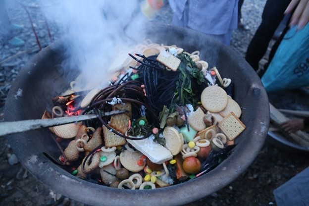 Hương linh người quá cố không ăn uống như người thường mà ‘ăn’ bằng hương thơm. Vì vậy, bên cạnh mâm cỗ chay, trong khóa lễ cúng cơm vong, nên chuẩn bị một bát bột gồm có các loại bột ngũ cốc, bánh các loại, bơ, sữa, bột hương, quế, hồi, đinh hương, thảo quả,… Khi đọc bài cúng cơm đến phần “Biến thực chân ngôn” thì đem bát bột này cùng với một số thức ăn trên mâm cúng ra ngoài đốt nhưng không đốt lên lửa mà chỉ đốt bằng than để tạo ra khói thơm. Thần thức cha mẹ, tổ tiên cửu huyền thất tổ sẽ thụ hưởng khói thơm này mà được no đủ.