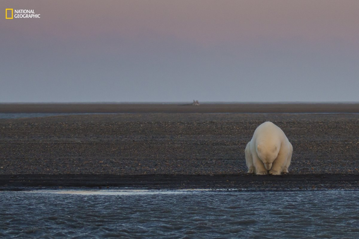 "Một con gấu ngồi cô độc trên bờ ở đảo Barter, Alaska. Lẽ ra vào thời điểm này phải có tuyết.