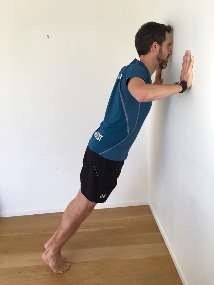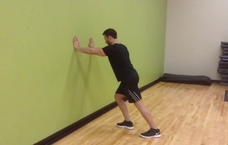 1. Đứng đối mặt với bức tường. Đặt hai bàn tay bạn ngang bằng vai và ấn vào tường. Giãn các ngón tay, cảm nhận chúng ấn vào bức tường và thu cùi chỏ lại gần lồng ngực.