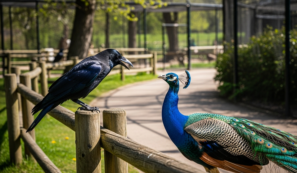 Nó thấy công đang bị nhốt trong lồng giữa sở thú, và hàng trăm người đang vây quanh ngắm nhìn. Khi đám đông rời đi, quạ đến gần hỏi: