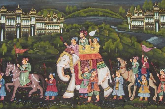 Một vị vua đang cưỡi voi đi thăm thú vương quốc của mình.