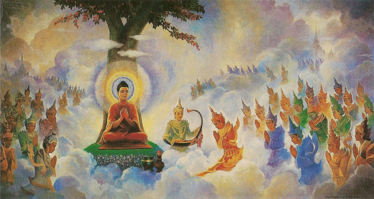 Một vị Vua Trời đến gặp Phật trong một hóa thân người Bà La Môn, với vẻ mặt rạng rỡ và bộ trang phục trắng như tuyết.